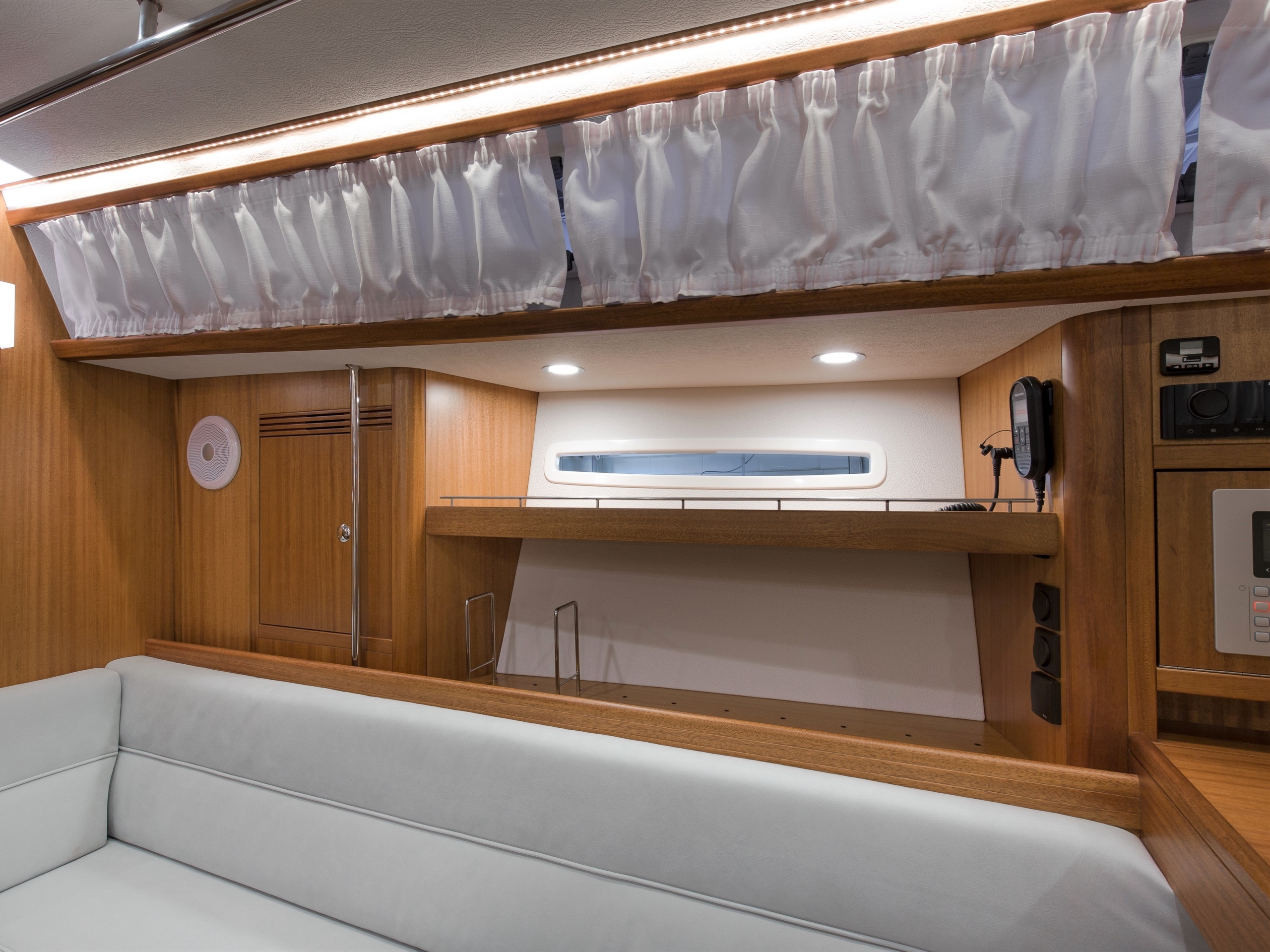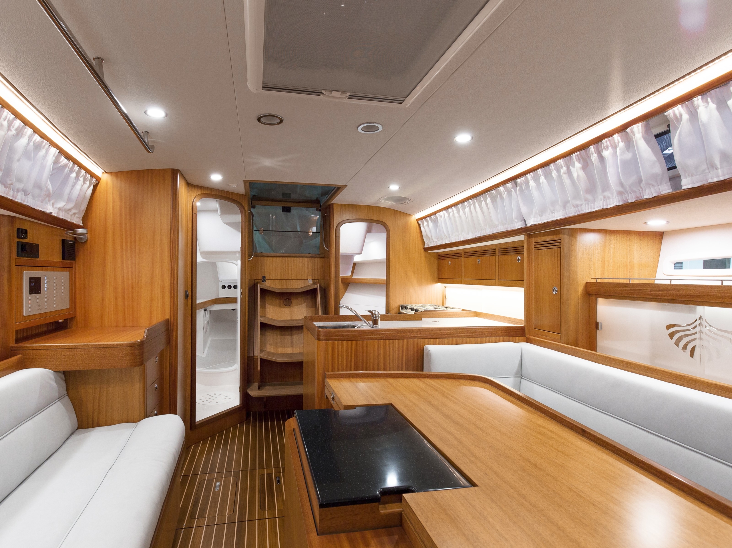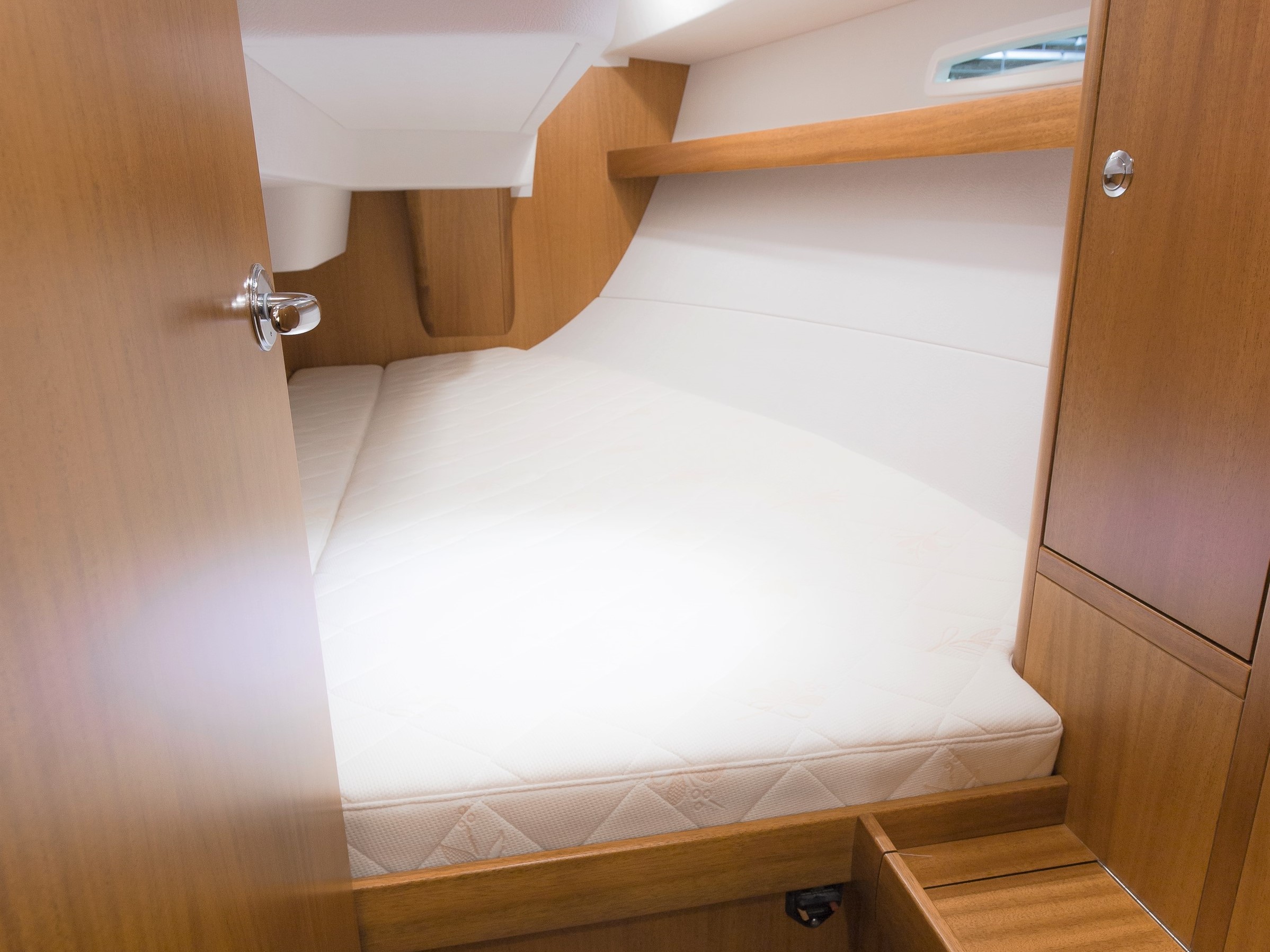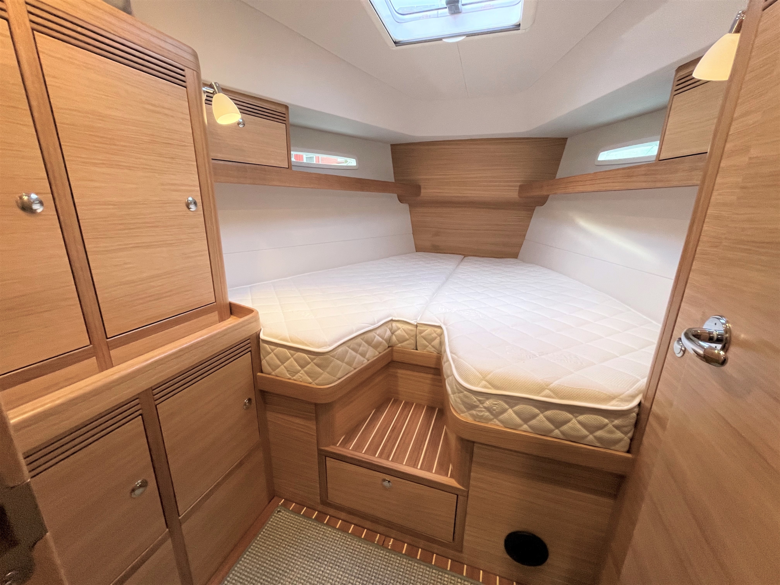 The Saare 38.2 is a perfect yacht for 2 to 4 people. In the foredeck there is an unusually large owner’s cabin with a fantastic bed, already equipped with an 18 cm thick luxury mattress as standard. There is also plenty of closet space available in this area.