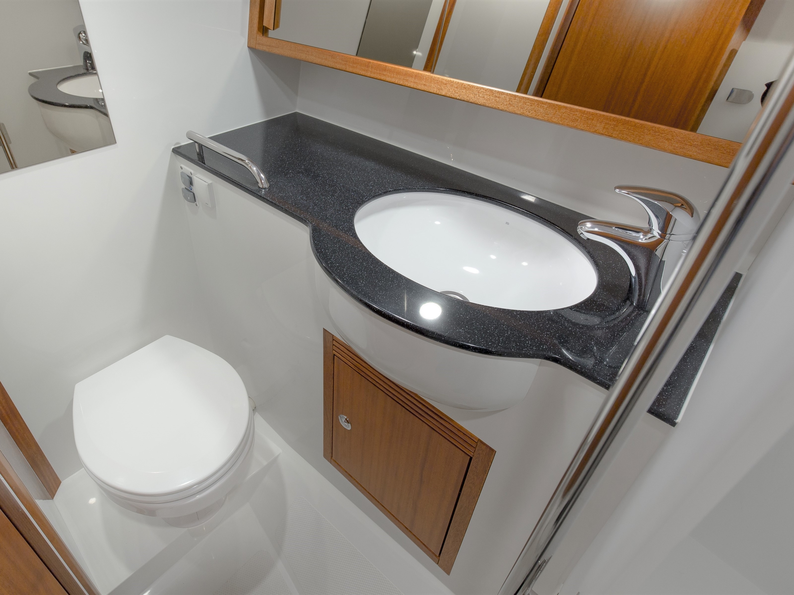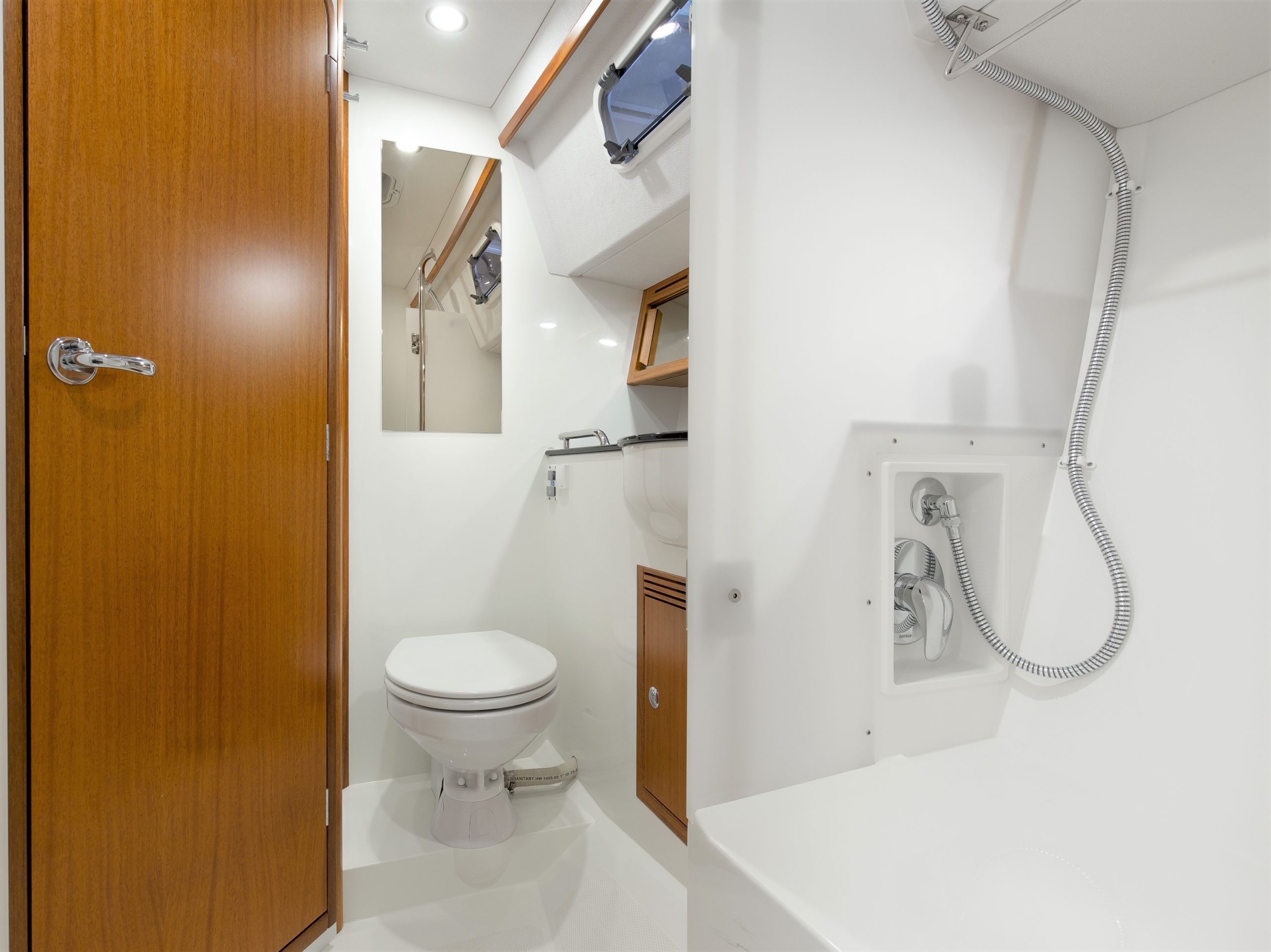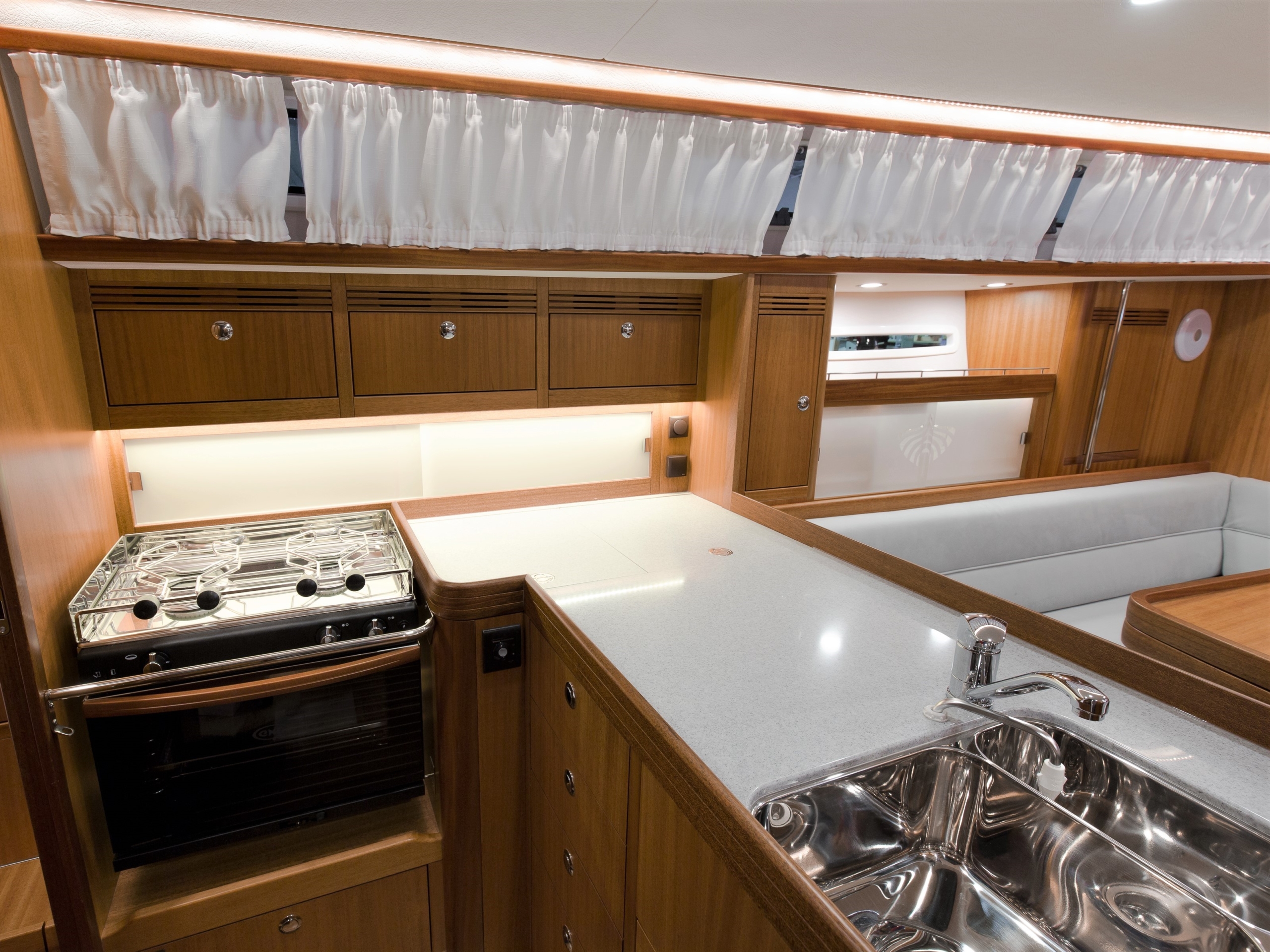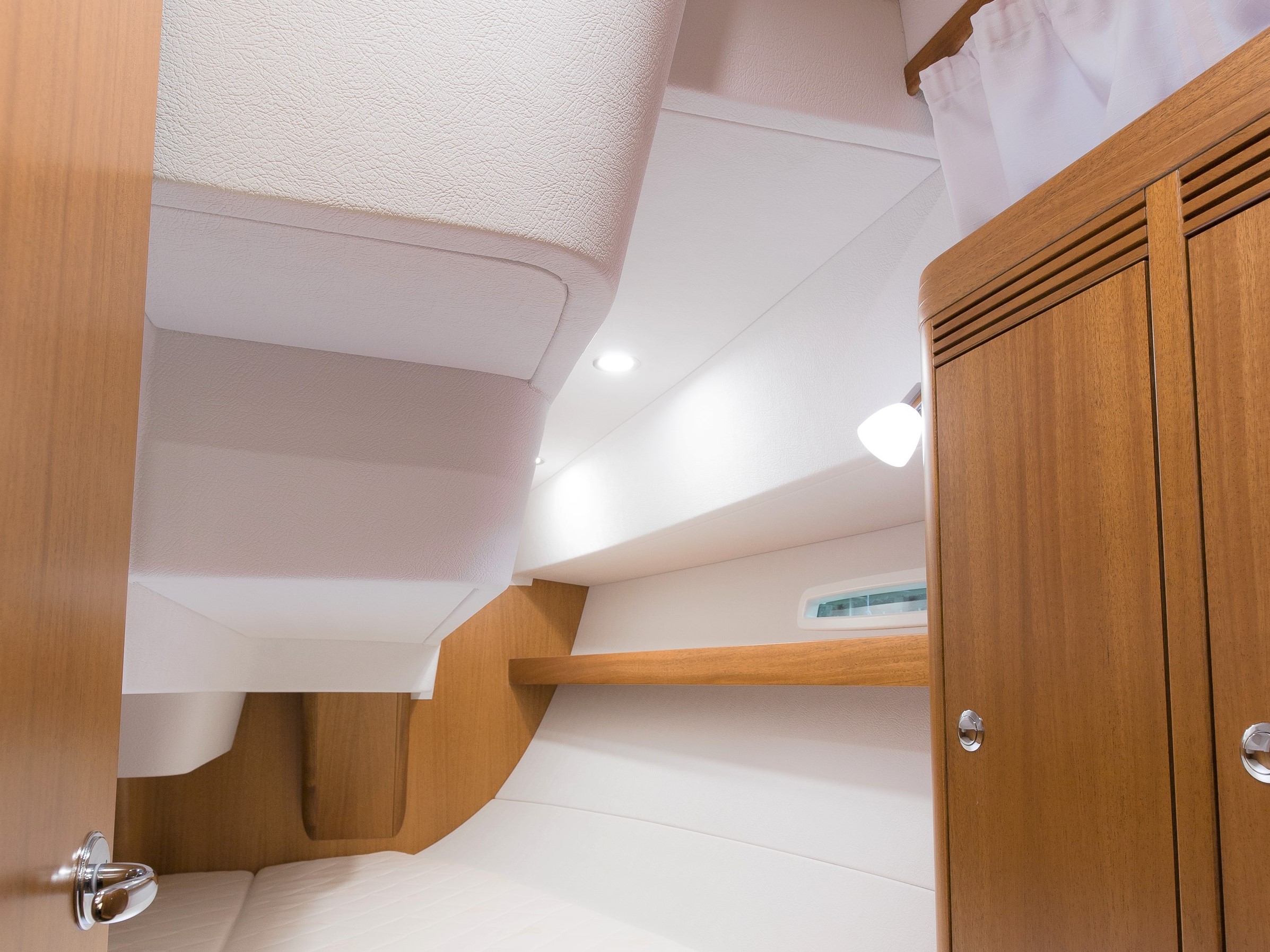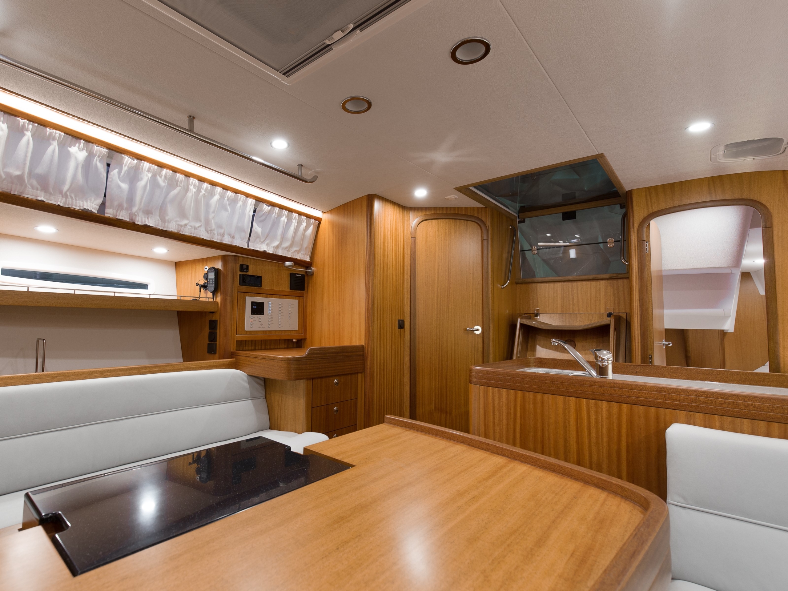 The Saare 38.2 is a perfect yacht for 2 to 4 people. In the foredeck there is an unusually large owner’s cabin with a fantastic bed, already equipped with an 18 cm thick luxury mattress as standard. There is also plenty of closet space available in this area.