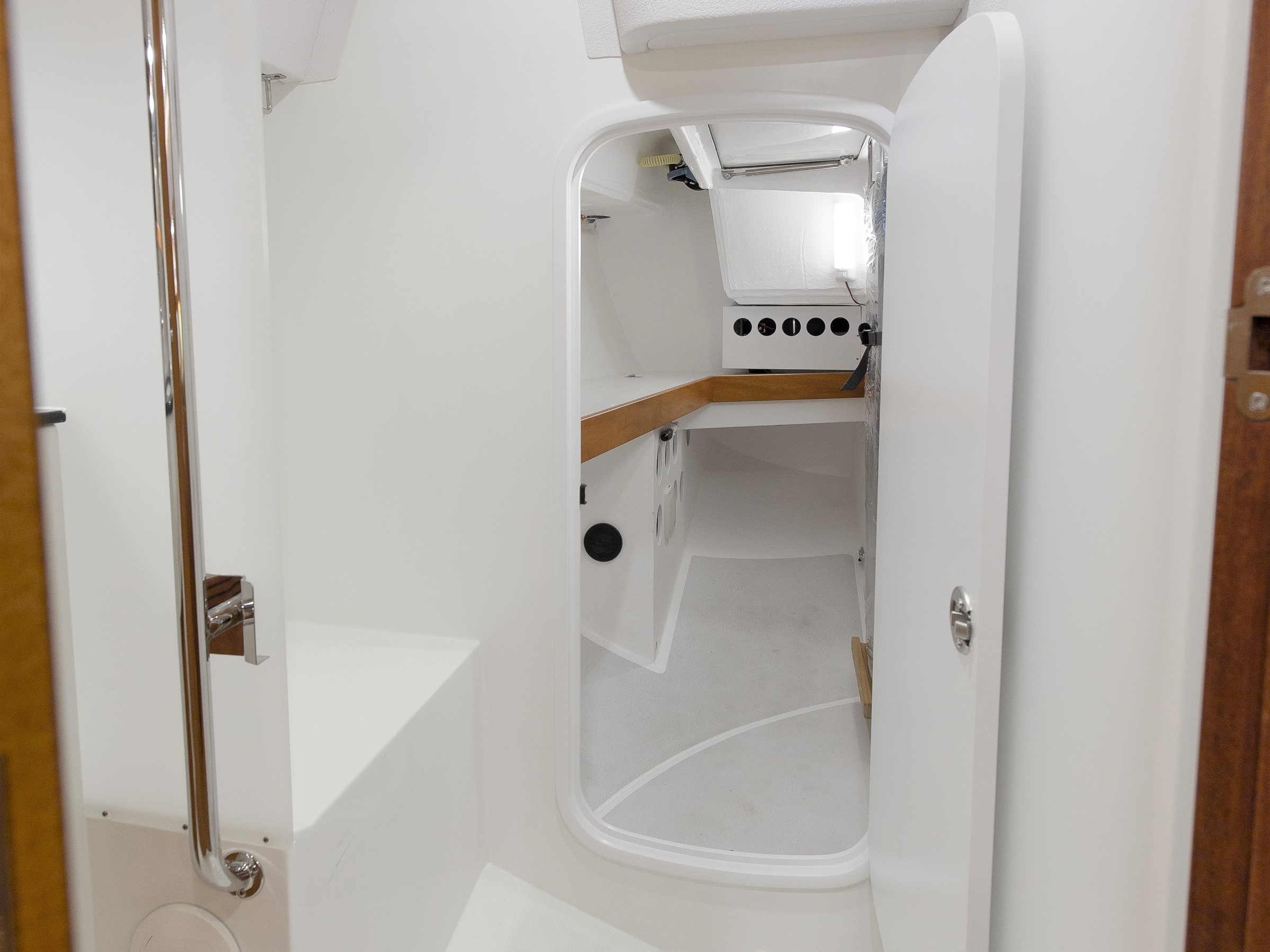 The double berth in the foredeck has dimensions that are rarely found even on much larger yachts, with a length of over 2 m and a width at the head end of 2.05 m. The wet room with sink, toilet in the direction of travel and a separable shower area is located right next to the companionway. The spacious pantry leaves nothing to be desired and offers an enormous amount of storage space. A walk-in locker and another large locker storage space, which can also be converted into a guest cabin, complete the picture. The large, waterproof sail storage space in the foredeck accommodates additional sails, a packed inflatable boat and much more equipment.
