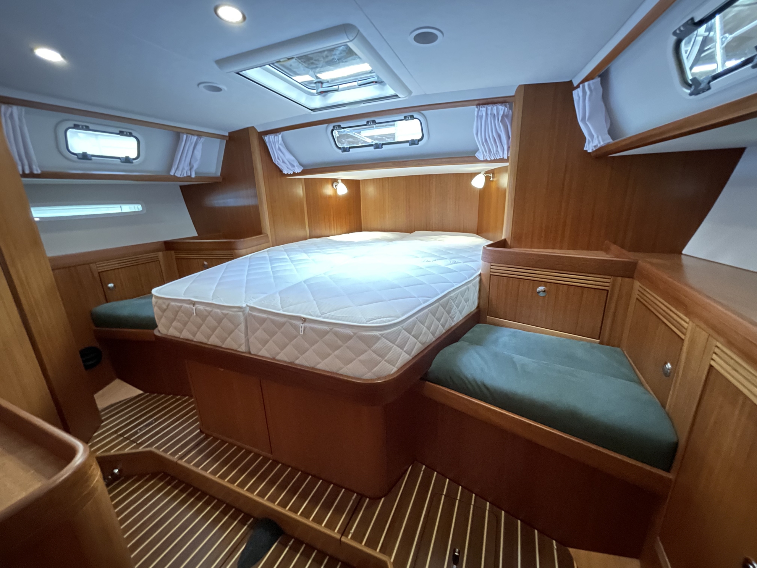 A large double bunk with a length of 205 cm and a width of 123 cm offers the best conditions for a restful sleep. There is plenty of closet and storage space, the entire cabin has many hatches and windows and is very airy. On the starboard side, the wet cellar for the owners is directly adjacent to the cabin.